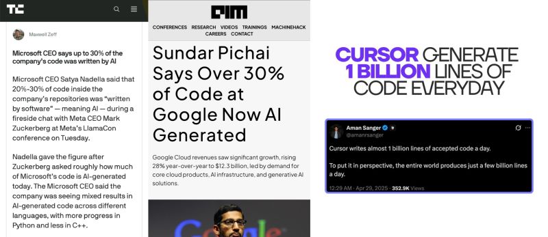 - 구글(Google) 역시 최근 실적 발표에서 전체 코드 중 30% 이상이 AI로 생성되고 있다고 밝혔습니다.