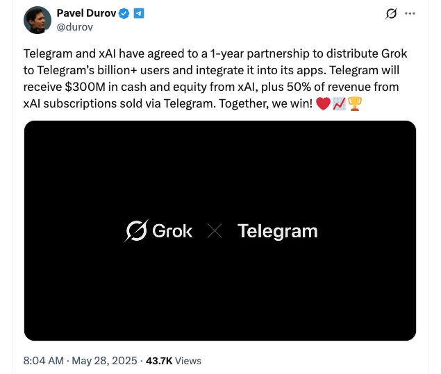🤝텔레그램과 xAI의 대형 파트너십